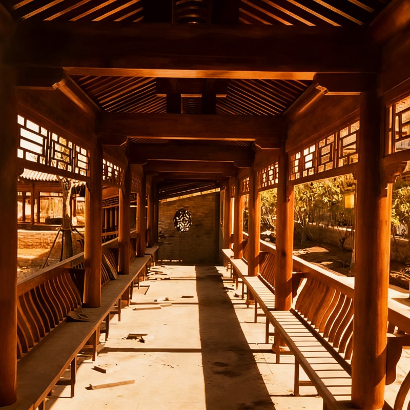 长廊古色木檐斜,光影斑驳印石阶 雕花窗棂透绿意,静坐此间享清宁